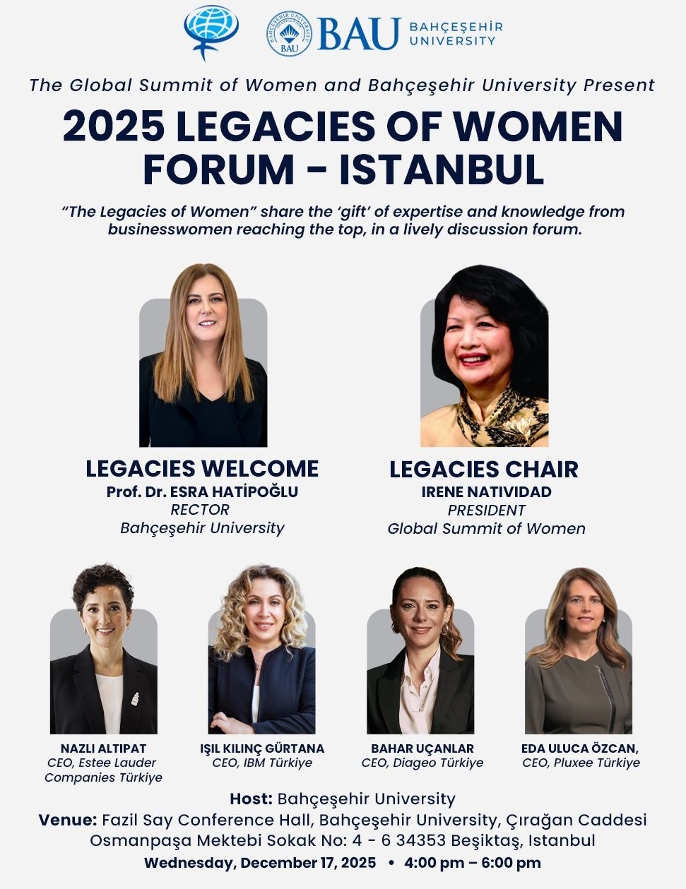 Küresel Kadın Zirvesi 2026’ya giden yolda ilk önemli adım ise deneyimli kadın liderlerle gençleri bir araya getiren ilham verici bir buluşma ile atılıyor. Bahçeşehir Üniversitesi ev sahipliğinde ve Küresel Kadın Zirvesi Başkanı Irene Natividad’in katılımıyla düzenlenen “Legacies of Women Forum”, geleceğin kadın liderlerine ilham vermek üzere 17 Aralık 2025’te İstanbul’da gerçekleştiriliyor. Zirvenin “Kadınlar: Cesur Bir Geleceğe Köprüler İnşa Etmek” temasını bugünden yansıtan forum, 2026 Küresel Kadın Zirvesi’ne giden yolculuğun başlangıç noktası olarak konumlanıyor.