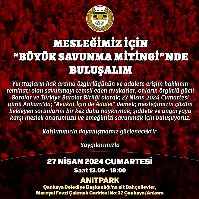 Türkiye Barolar Birliği ve Barolar tarafından Ankara’da ‘Büyük Savunma Mitingi’ düzenlenecek.