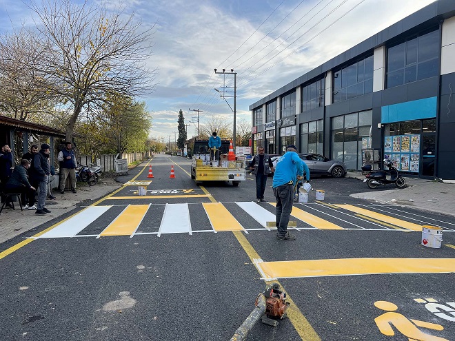 Asfalt çalışmaları sonrası yol çizgileri ve yaya geçitleri imalatları tamamlanan ilçedeki