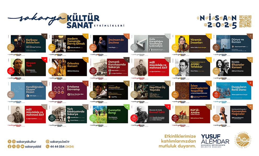 Sakarya Büyükşehir Belediyesi Nisan kültür sanat takvimi, sanata ve kültüre ışık tutacak programlarla kapılarını açıyor. Birbirinden değerli konu ve konukların yer alacağı etkinliklerde, sergi programları, konferanslar, tiyatro gösterimi, seminer, söyleşi ve dinleti programları sanatseverleri ağırlayacak.
