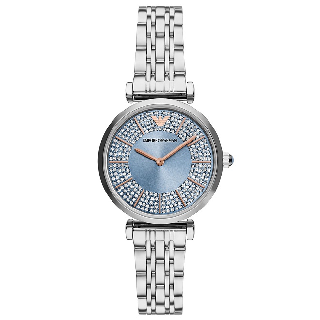 Şıklığı ve modernliği bir araya getiren Emporio Armani’nin bir diğer modeli ise gümüşün dinginliğini ve mavinin büyüleyici tonlarını bir araya getiriyor.Taşların ışıltısını bu kez mavi kadrana taşıyan bu modelde, yine rose gold rengindeki zarif göstergelerin arasına yerleştirilmiş 5 sıra kristal taşlar dikkat çekiyor.