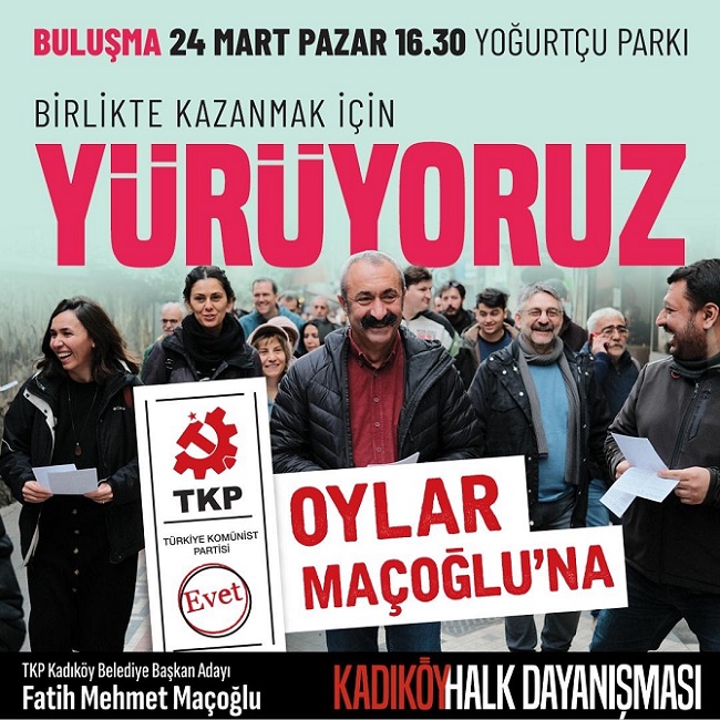 Türkiye Komünist Partisi Kadıköy Belediye Başkan adayı Fatih Mehmet Maçoğlu X hesabından yaptığı paylaşımla Kadıköylüleri yürüyüşe davet etti.