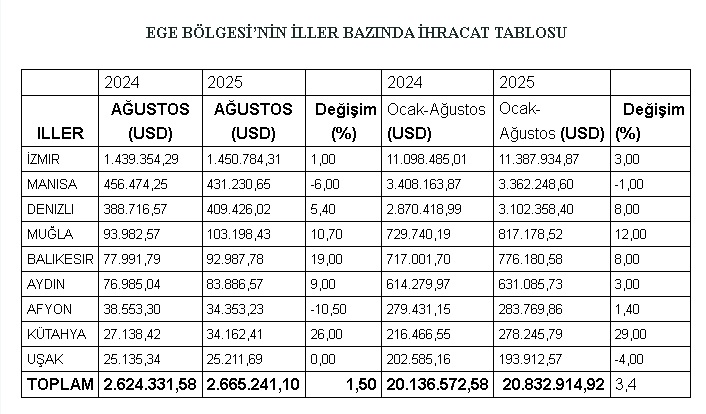 Ege Bölgesi, 2025 yılının 8 aylık döneminde ihracatını yüzde 3,4’lük artışla 20 milyar 136 milyon dolardan 20 milyar 832 milyon dolara yükseltti.