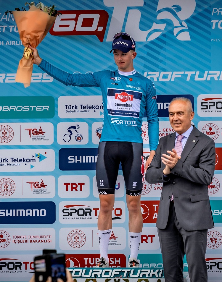 Spor Toto sponsorluğunda Genel Klasman Liderinin giydiği turkuaz mayoyu Tibor Del Grosso’ya, Türkiye Bisiklet Federasyonu Başkanı Emin Müftüoğlu verdi.