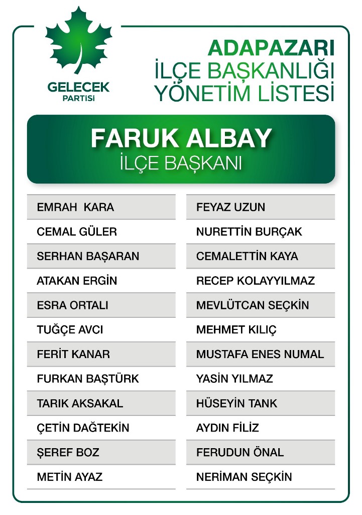 Gelecek Partisi, Adapazarı İlçe Teşkilatı 1. Olağan Kongresi gerçekleştirildi. Tek liste halinde gidilen kongrede kurucu başkan Faruk Albay yeniden ilçe başkanı seçildi.