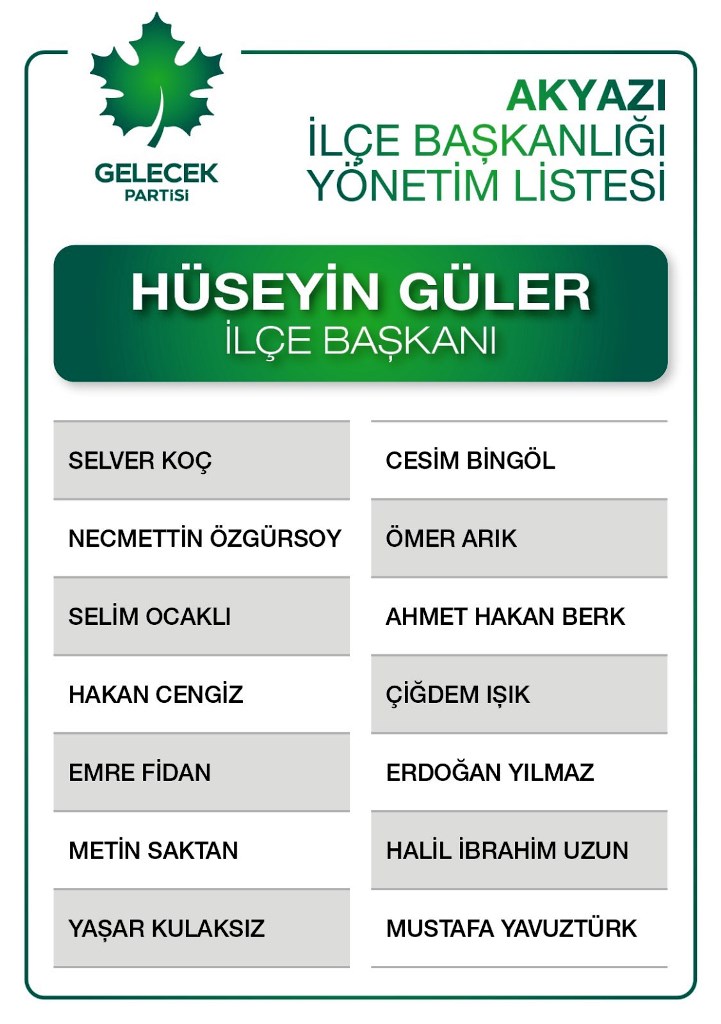 Gelecek Partisi, Akyazı İlçe Teşkilatı 1. Olağan Kongresi gerçekleştirildi. Tek liste halinde gidilen kongrede kurucu başkan Hüseyin Güler yeniden ilçe başkanı seçildi.