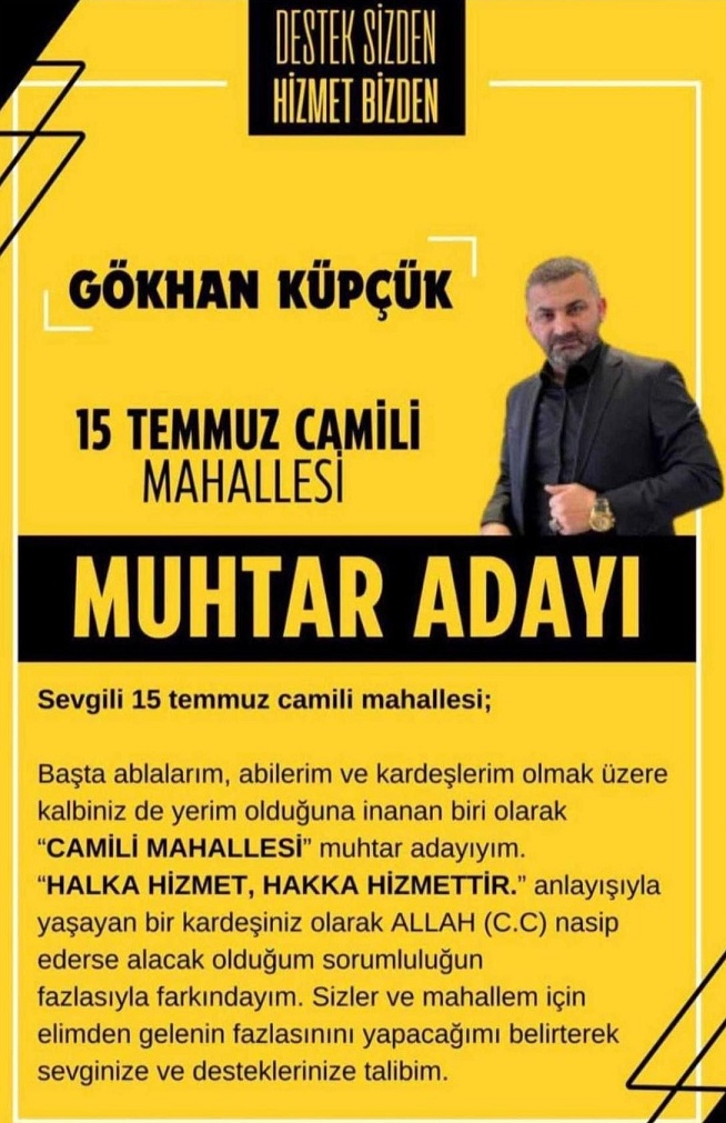 15 Temmuz Mahallesi Muhtar adaylığını açıklayan Gökhan Küpçük, “Mahallemizde çalmadığımız kapı kalmayacak. El ele vererek bütün sorunları çözeceğiz” dedi.