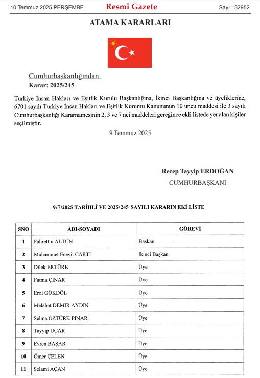 Cumhurbaşkanlığı İletişim Başkanlığı görevini yürüten Fahrettin Altun, Türkiye İnsan Hakları ve Eşitlik Kurulu (TİHEK) başkanlığına atandı.
