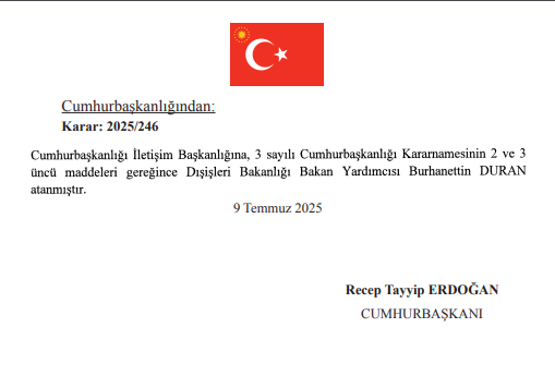 Resmî Gazete’de yayımlanan son Cumhurbaşkanlığı atama kararıyla Altun’un yerine Burhanettin Duran getirildi.