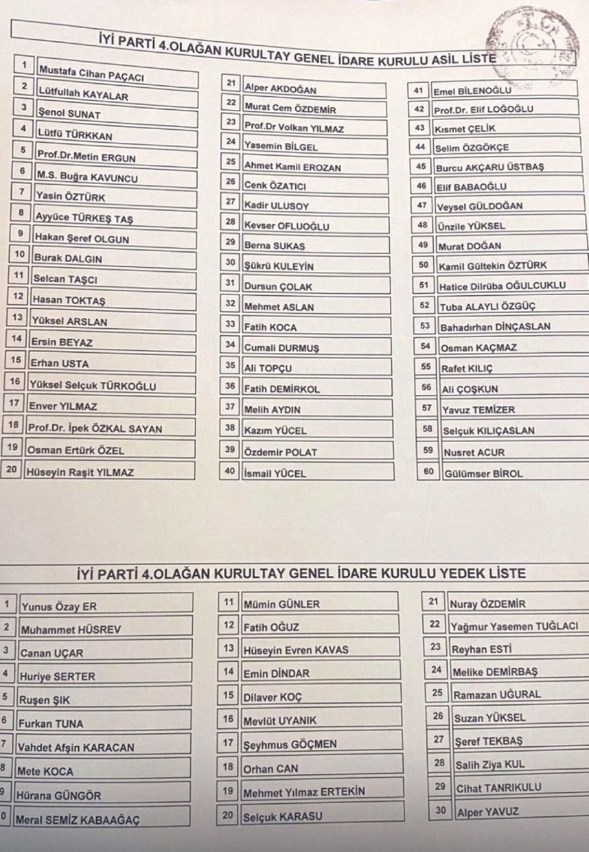 İyi Parti‘nin 4. Olağan Kurultayı’nda blok liste usulüyle yapılan seçimin resmi olmayan sonucuna göre, 60 kişilik Genel İdare Kurulu (GİK) ve 11 kişilik Merkez Disiplin Kurulu (MDK) belli oldu.