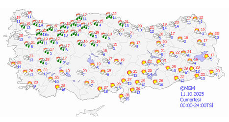 Meteoroloji Genel Müdürlüğü tarafından yapılan tahminlere göre ülkemizin kuzey, iç ve batı kesimlerinin parçalı, yer yer çok bulutlu, Marmara (Edirne ve Çanakkale hariç), Batı Karadeniz, Doğu Karadeniz kıyıları ile Eskişehir ve Ordu çevrelerinin yağmur ve sağanak yağışlı, yer yer gök gürültülü sağanak yağışlı, diğer yerlerin az bulutlu ve açık geçeceği tahmin ediliyor.
