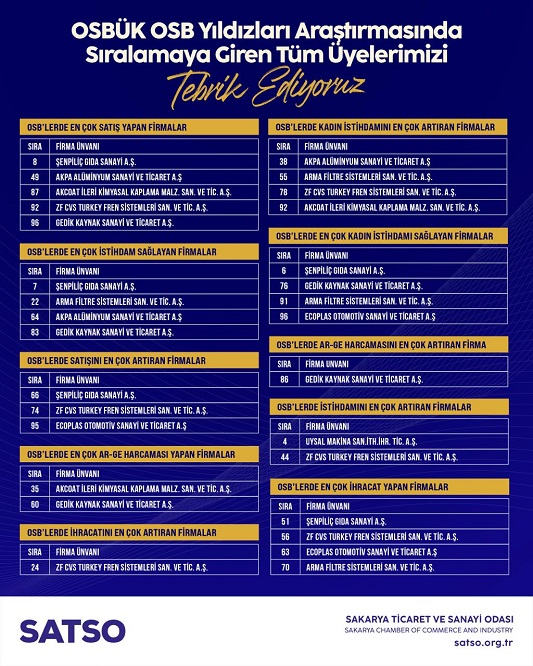başarısı göstererek dikkat çekti. Böylece ayrı 10 listede 30 Sakarya iş dünyası