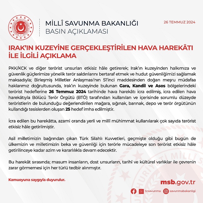 “Irak’ın kuzeyinden halkımıza ve güvenlik güçlerimize yönelik terör saldırılarını bertaraf etmek ve hudut güvenliğimizi sağlamak maksadıyla Birleşmiş Milletler Anlaşması’nın 51. maddesinden doğan meşru müdafaa haklarımız doğrultusunda, Irak’ın kuzeyinde bulunan Gara, Kandil ve Asos bölgelerindeki terörist hedeflerine 26 Temmuz 2024 tarihinde hava harekatı icra edilmiş, icra edilen hava harekatıyla bölücü terör örgütü (BTÖ) tarafından kullanılan ve içerisinde sorumlu düzeyde teröristlerin de bulunduğu değerlendirilen mağara, sığınak, barınak, depo ve terör örgütünün kullandığı tesislerden oluşan 25 hedef imha edilmiştir.”
