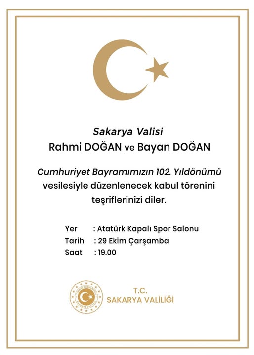 Cumhuriyetimizin kuruluşunun 102. yılı vesilesiyle, cumhuriyetimizin banisi Gazi Mustafa Kemal Atatürk ve silah arkadaşları başta olmak üzere ahirete irtihal eden aziz şehitlerimizi ve kahraman gazilerimizi rahmet, minnet ve şükranla yâd ediyorum. Milletimizin ve Sakaryalı hemşerilerimin 29 Ekim Cumhuriyet Bayramı’nı en samimi duygularımla tebrik ediyor; saygı ve muhabbetlerimi sunuyorum.