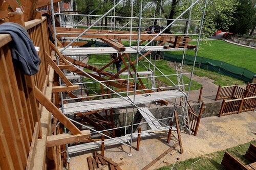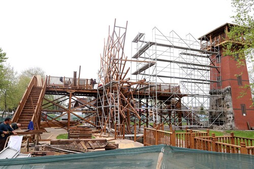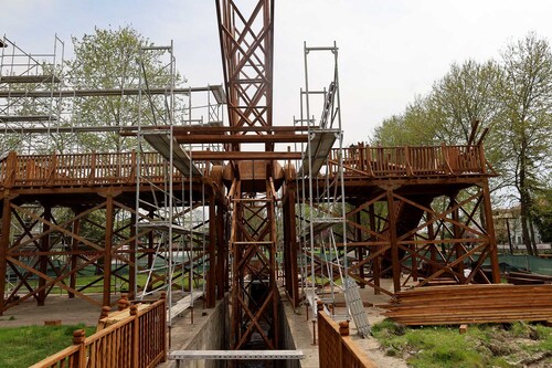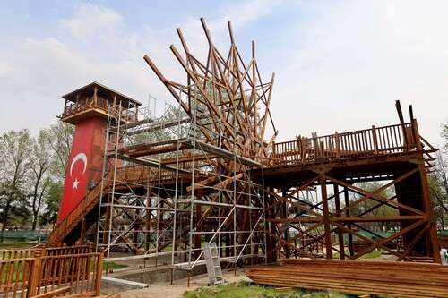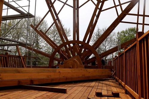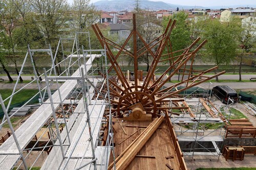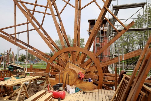 Tarihi Çark’ın kule bölümünde ahşap işçilik ve montaj işlemleri tamamlanırken, çarkın yeniden oluşturulmasına yönelik çalışmalar devam ediyor. Dönel mekanizmanın montajı tamamlandı, kolların ve su taşıyan bölümün imalatında ise son aşamaya gelindi.