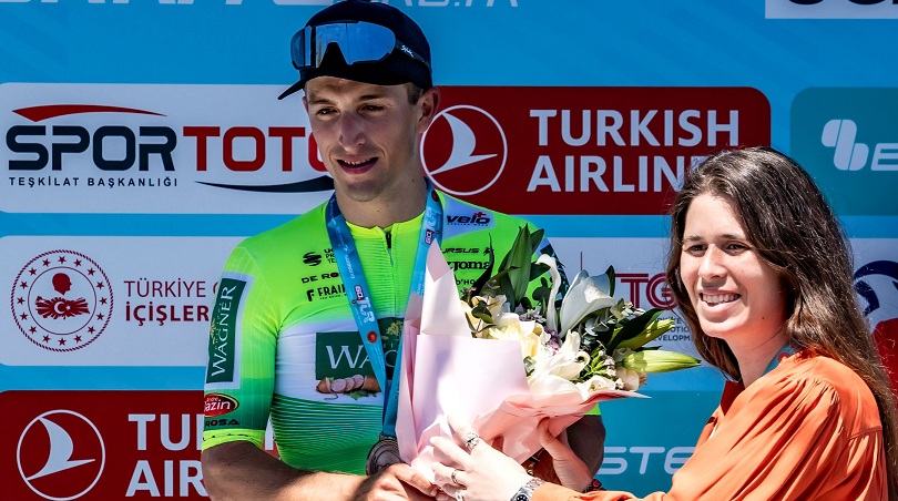 Spor Toto sponsorluğunda genel klasman liderinin giydiği turkuaz mayoyu Wout Poels’e, Türkiye Bisiklet Federasyonu Başkanı Emin Müftüoğlu verdi.
