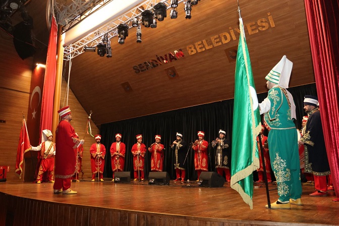 Etkinlikler kapsamında akşamın ilk bölümünde sahne alan mehteran takımı, sergilediği