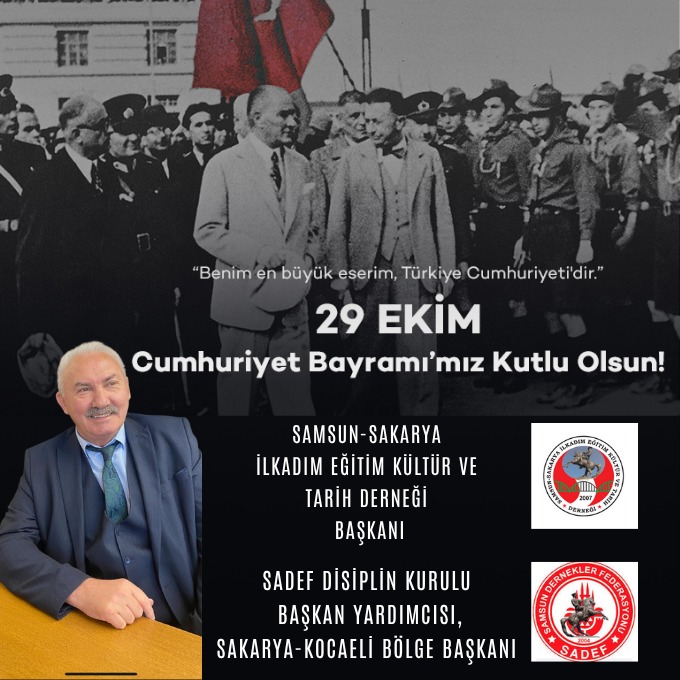Samsun- Sakarya İLKADIM Eğitim Kültür ve Tarih Derneği Başkanı ve SADEF Disiplin Kurulu Başkan Yardımcısı SAKARYA-KOCAELİ Bölge Başkanı Emlak eğitmeni – Aile danışmanı -Sosyolog-Kentsel Dönüşüm Uzmanı Hasan KARGÜN ‘ün 29 EKİM CUMHURİYET BAYRAMI MESAJI