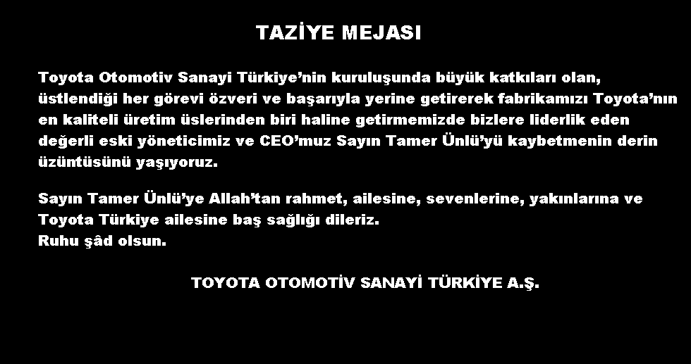 Toyota Otomotiv Sanayi Türkiye’nin kuruluşunda büyük katkıları olan, üstlendiği her görevi özveri ve başarıyla yerine getirerek fabrikamızı Toyota’nın en kaliteli üretim üslerinden biri haline getirmemizde bizlere liderlik eden değerli eski yöneticimiz ve CEO’muz Sayın Tamer Ünlü’yü kaybetmenin derin üzüntüsünü yaşıyoruz.