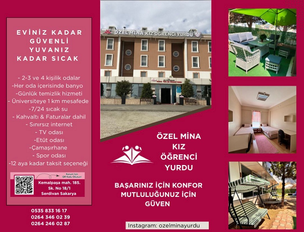 ÖZEL MİNA KIZ ÖĞRENCİ YURDU Telefon: 0535 833 1617 Kemalpaşa Mahallesi 185. Sokak No: 18/1. Serdivan / SAKARYA