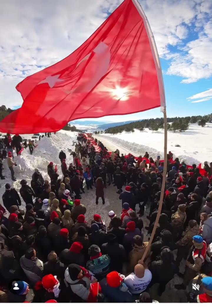 Ellerinde Türk bayrakları bulunan binlerce kişi, burada Kur’an-ı Kerim okuyup tekbir ve salavatlar getirerek şehitler için dua ettikten sonra soğuk havada Ay-Yıldızlı Tören Alanı’na doğru yürüyüşe geçti.