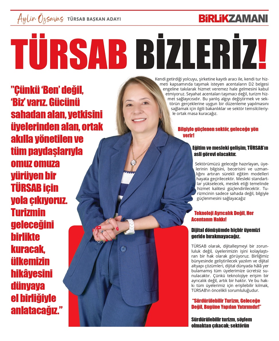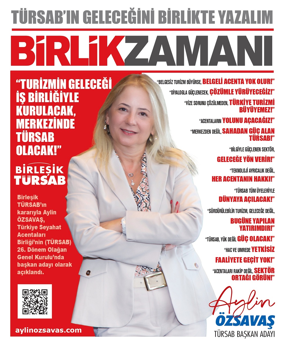 Türkiye Seyahat Acentaları Birliği’nin (TÜRSAB) Kasım 2025’te gerçekleşecek olan 26. Dönem Olağan Genel Kurulu’nda, yeni başkan adayı olarak Aylin ÖZSAVAŞ resmen aday olarak kamuoyuna duyurulmuştur. Bu adaylık, Birleşik TÜRSAB bünyesinde alınan karar doğrultusunda kamuya açıklanmıştır.