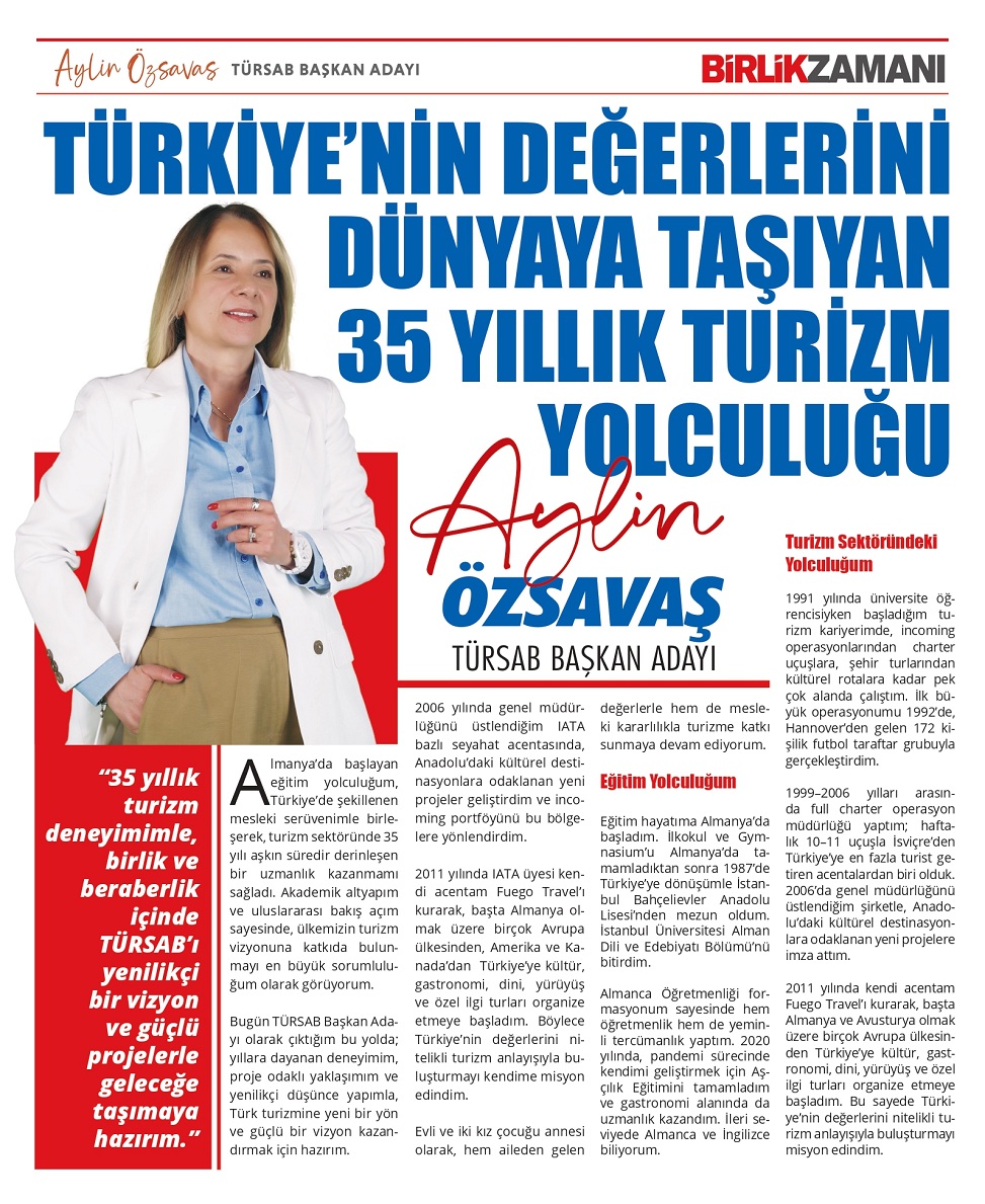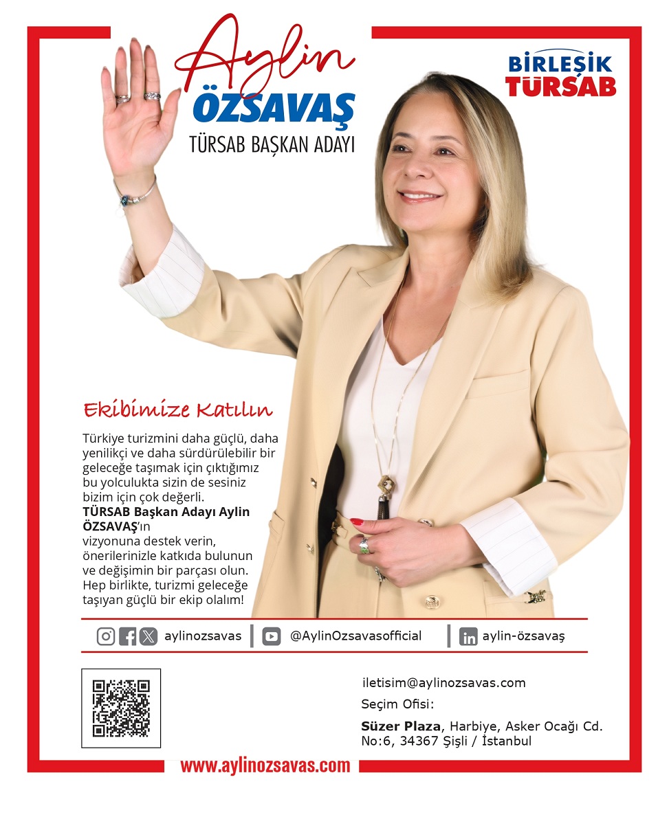TÜRSAB Başkan Adayı Aylin ÖZSAVAŞ Turizmin geleceğini birlikte şekillendirmek için şimdi adım atın ve fark yaratın!
