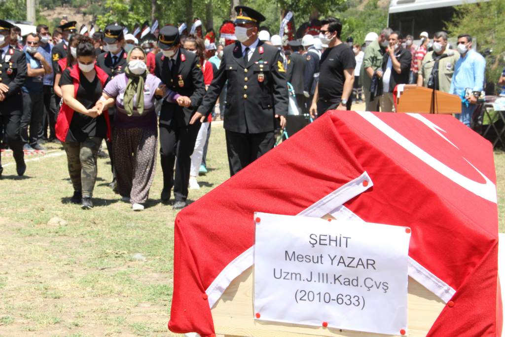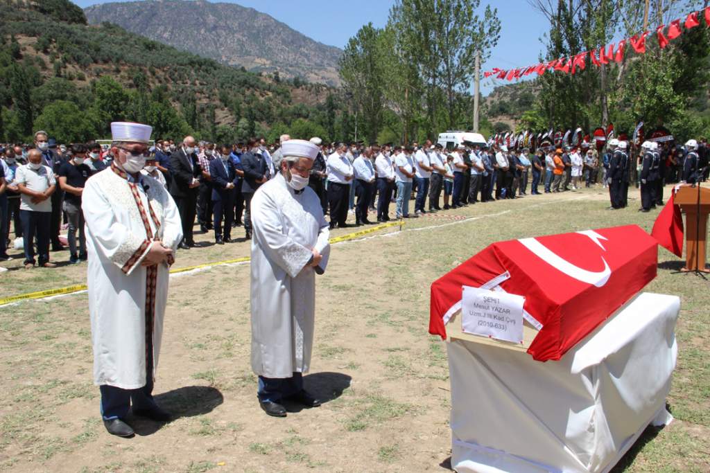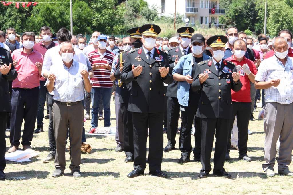 Tören öncesi şehit Yazar’ın cenazesi baba ocağına getirilerek helallik alındı. Burada yapılan dualarla birlikte şehit Yazar’ın cenazesi korona virüs tedbirleri dolayısıyla geniş alana sahip olan Uluderbent Mahallesi spor sahası içerisine getirildi. Burada cuma namazını müteakip kılınan cenaze namazının ardından şehit Uzman Jandarma Kademeli Çavuş Mesut Yazar, mahalle mezarlığına defnedildi.