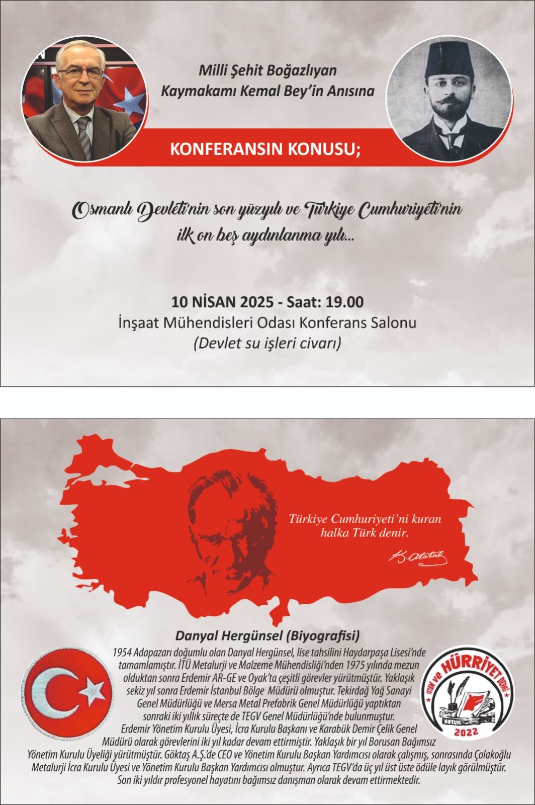 10 Nisan 2025 Perşembe günü saat 19.00’da İnşaat Mühendisleri Odası Sakarya Şube İstiklal Mah. Bölük Sokak No: 33 Adapazarı