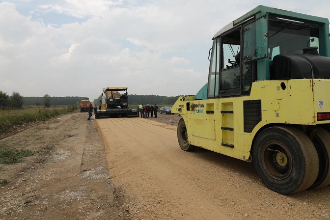 uzunluğundaki yolda asfalt öncesinde PMT (Plent Miks Temel) malzemesi serim çalışmaları