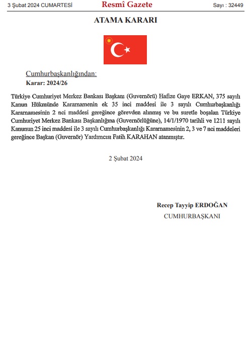 Fatih Karahan’ın Cumhurbaşkanı Recep Tayyip Erdoğan tarafından Merkez Bankası Başkanlığına getirilmesine ilişkin karar Resmî Gazete’de yayımlanarak yürürlüğe girdi.